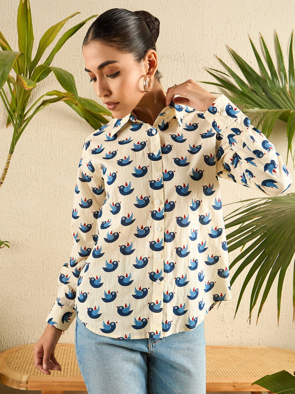 Add a playful twist to your everyday style with this Beige & Blue Bird Print Button-Down Shirt. Featuring a cream base adorned with quirky blue bird motifs, this shirt strikes the perfect balance between fun and sophistication. The eye-catching print makes it a conversation starter, while the button-down silhouette keeps it versatile and timeless.