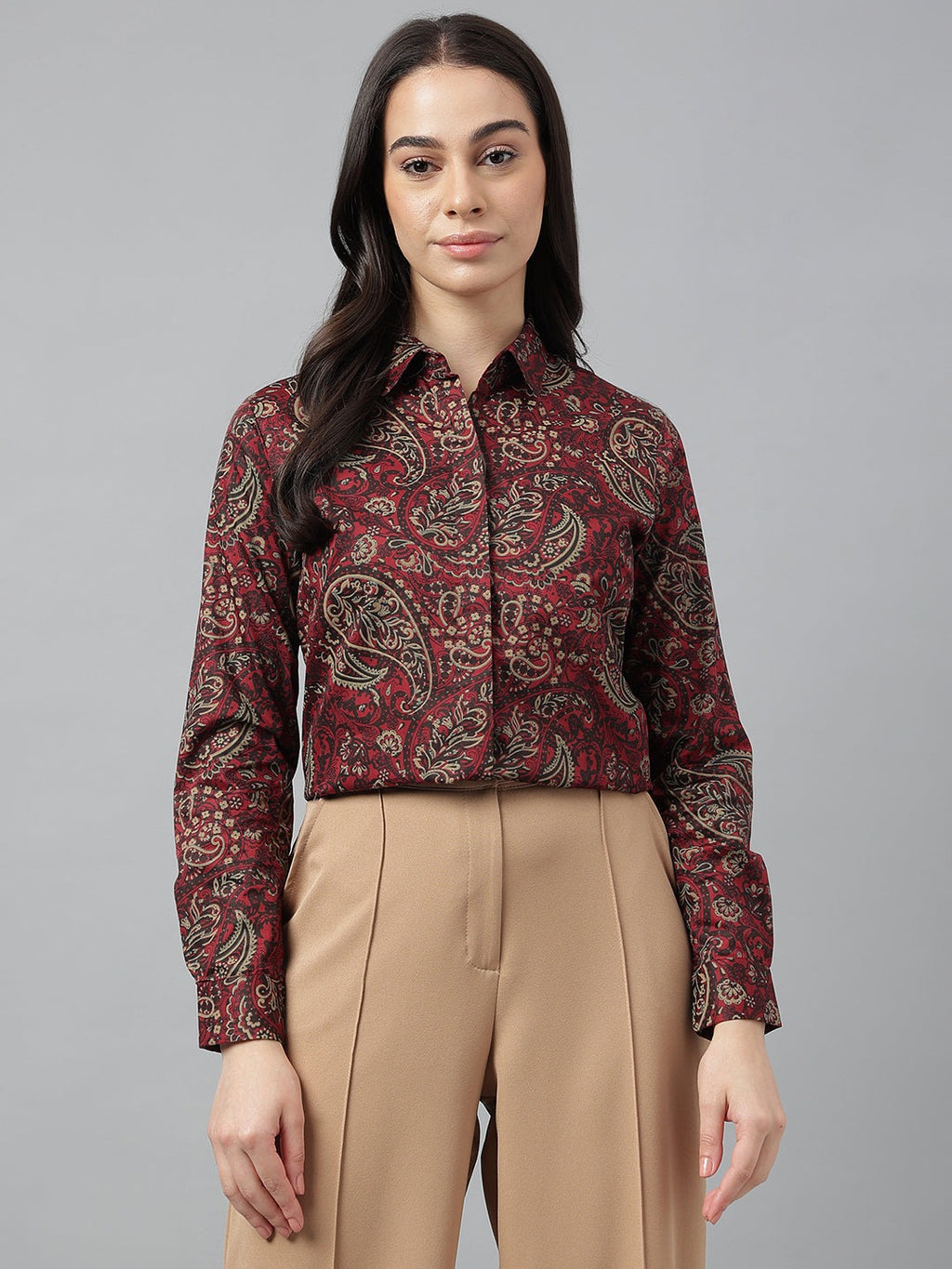Pair it with tailored trousers for a polished professional look or style it with denims for a chic off-duty vibe. With its rich colors and classic print, this shirt is designed for those who love to stand out with understated elegance.