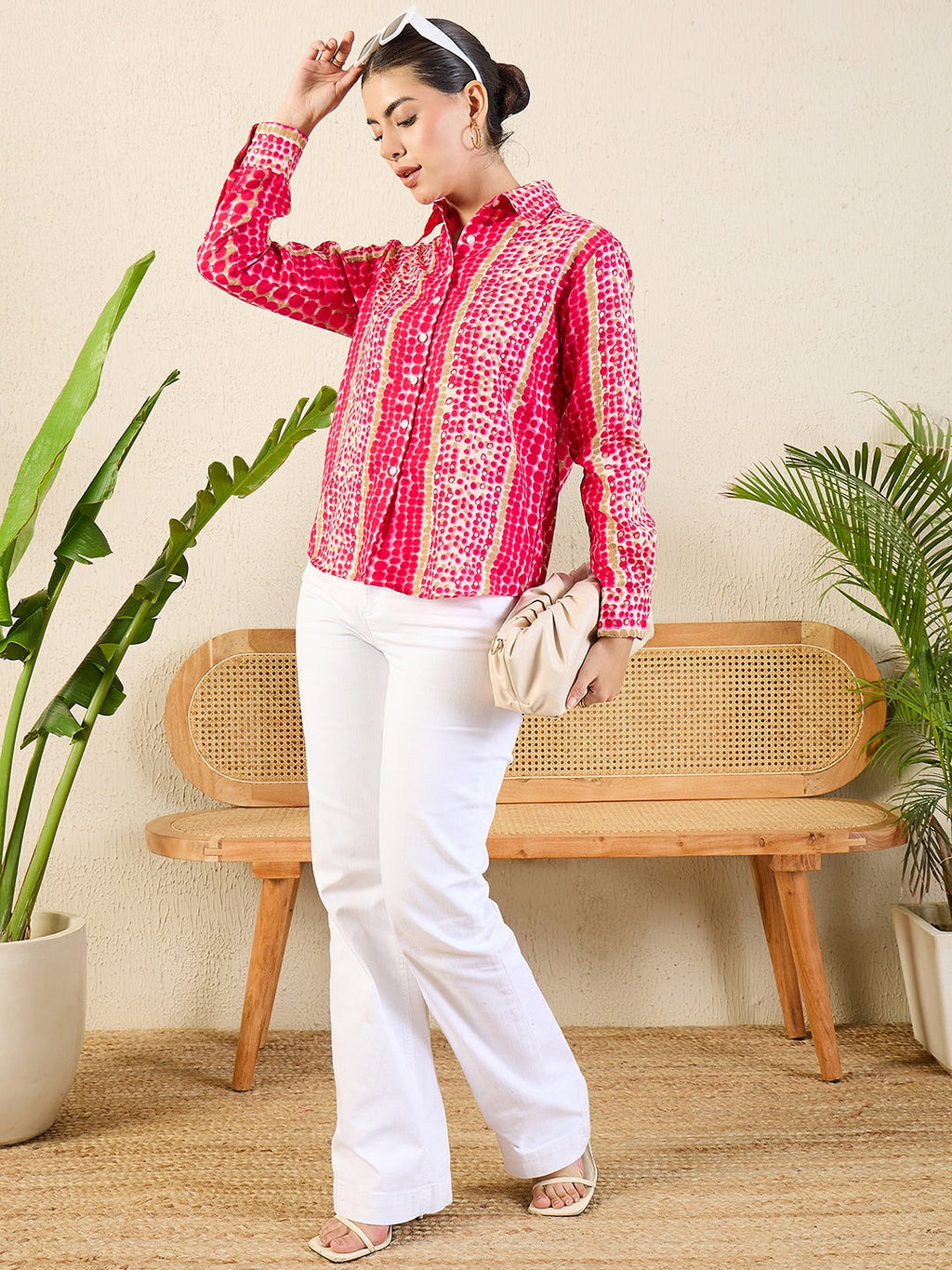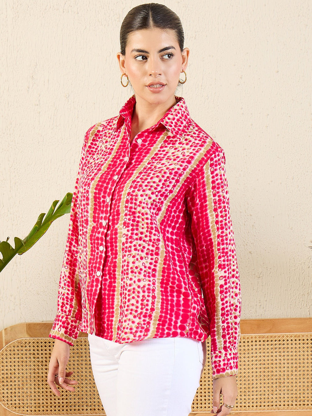 Brighten up your look with this pink and beige printed button-up shirt for women. Featuring a tie-dye inspired dotted stripe design, it’s perfect for casual outings, brunch, or chic everyday wear.
