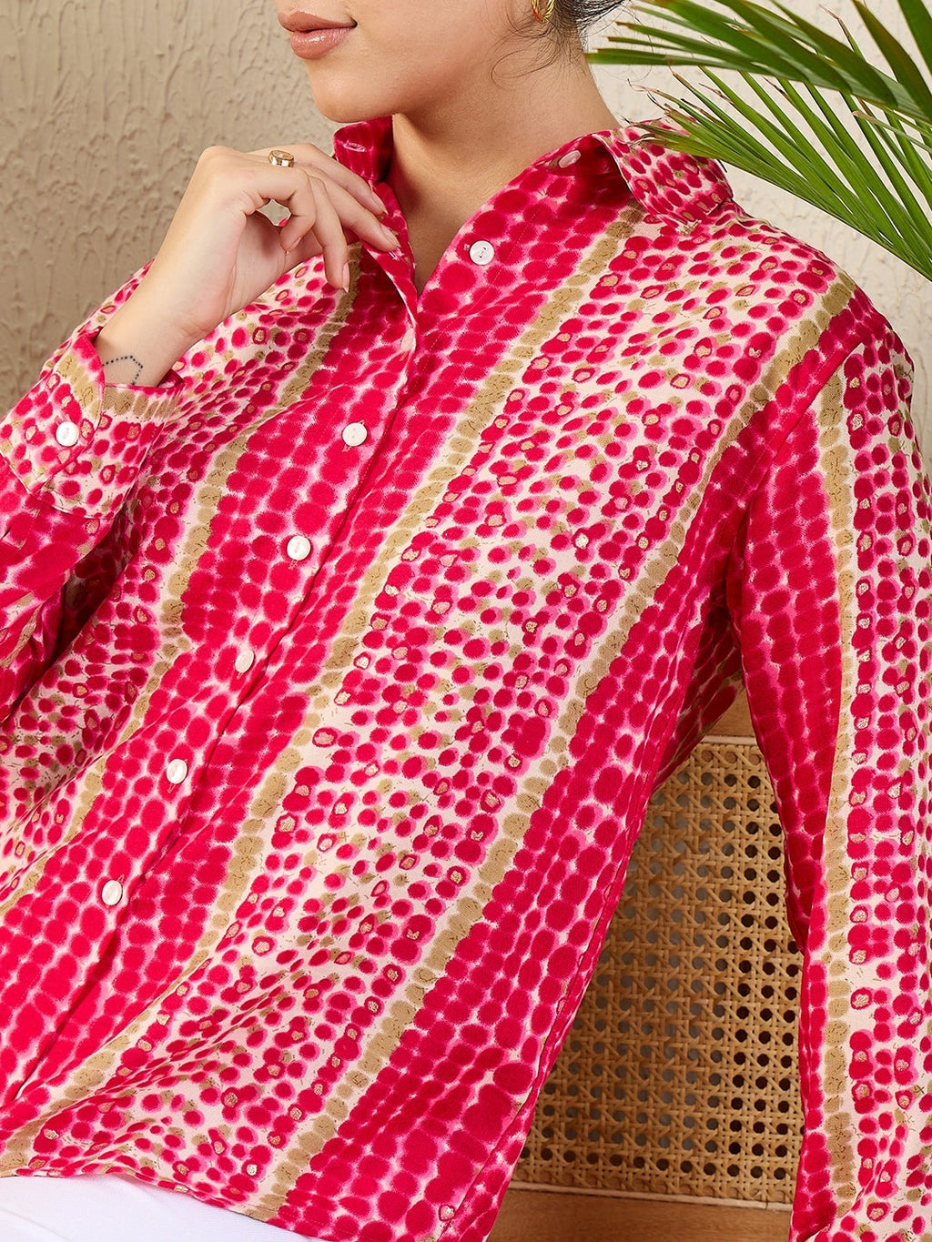 Vibrant Pink & Beige Tie-Dye Inspired Printed Button-Up Shirt