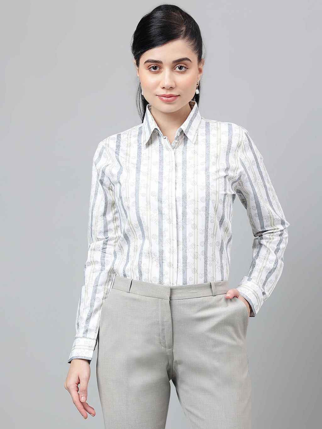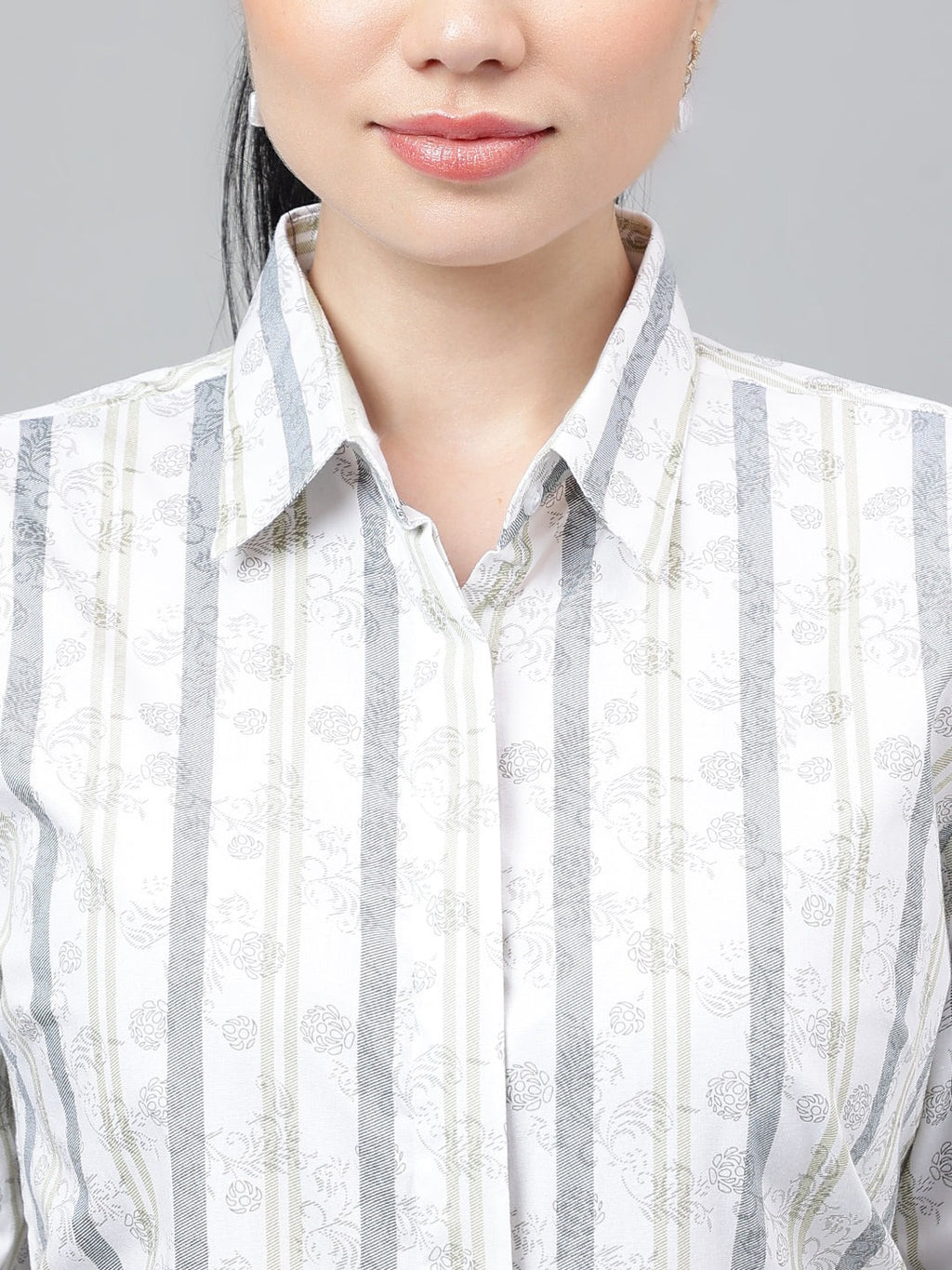 Elevate your workwear with this white and grey striped shirt that blends classic tailoring with subtle elegance. Featuring vertical stripes with a delicate floral undertone, this shirt is perfect for creating a sleek, elongated silhouette. The collared neckline, long sleeves, and button-down front give it a polished formal appeal, while the soft fabric ensures lasting comfort throughout the day. Its versatile design makes it a wardrobe essential—pair it with grey trousers for a professional office look or with jeans for a chic smart-casual vibe.